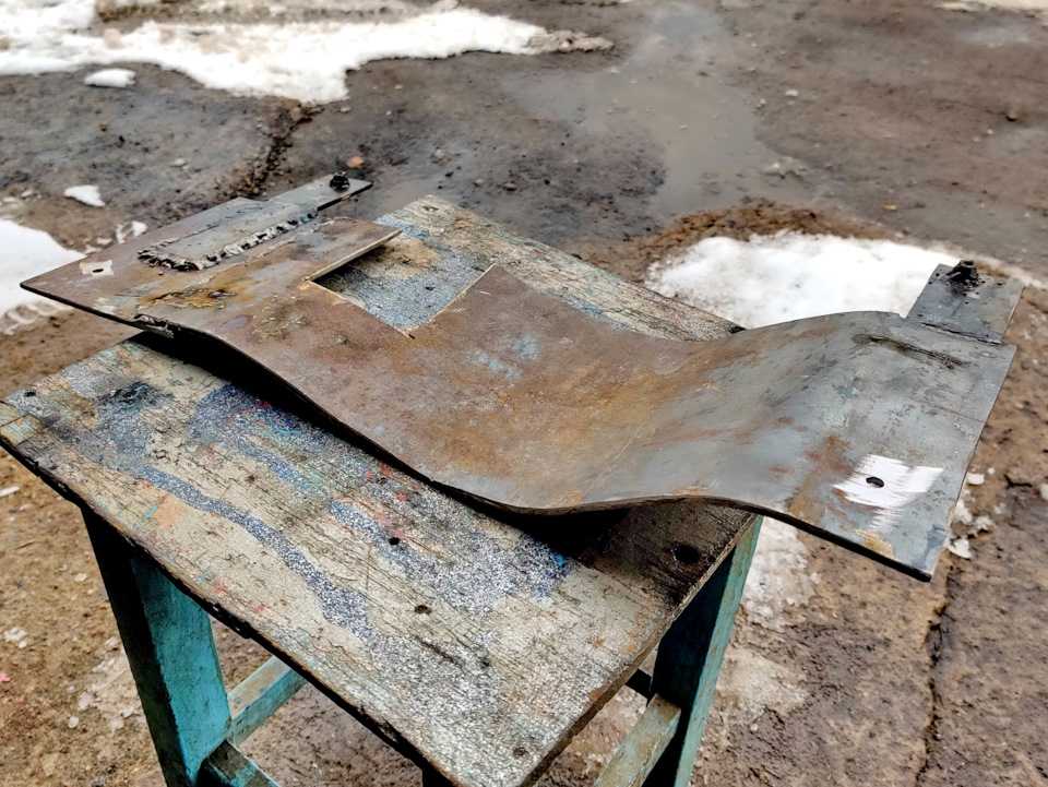 Нежданчик, который я не учёл! Это место выхлопной системы является самым низким от земли, плюс гофра толще, чем труба и её, получается, очень легко повредить на нашем бездорожье. Пришлось кумекать.В гараже были остатки металла, обрезки листов толщиной 4 мм. Из них соорудил защиту.