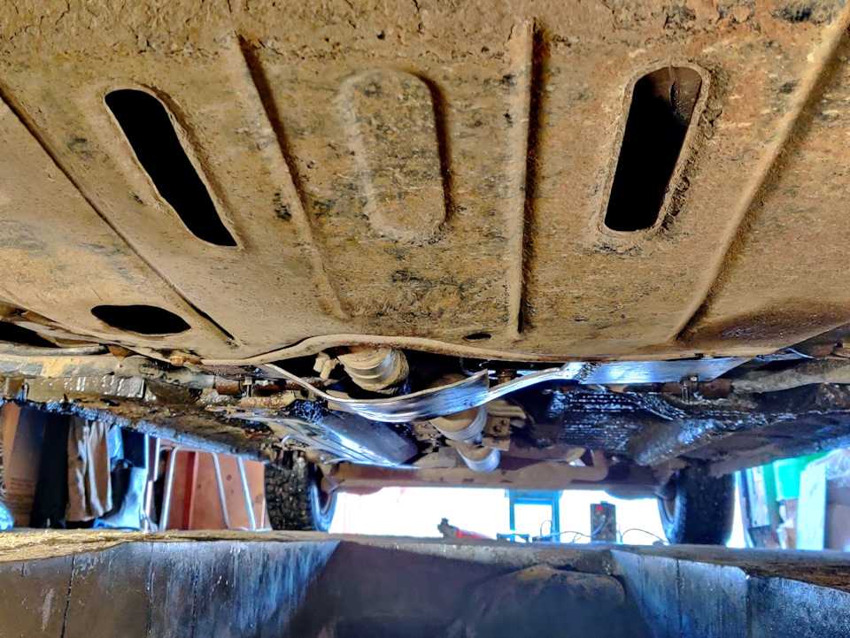 После того, как я сня защиту двигателя, выяснилось, что новую гофру не получится установить на старое место. Там труба в двух местах делает изгиб и, после установки, гофра будет сильно изогнута, что недопустимо, она очень быстро выйдет из строя. Пришлось выбрать место чуть подальше, где есть ровный участок трубы.