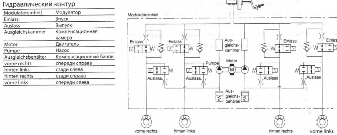 На рисунке представлен гидравлический контур закрытой 4-канальной антиблокировочной системы с разделением контуров тормозного привода по диагонали при помощи 2/2-ходовых электромагнитных клапанов.