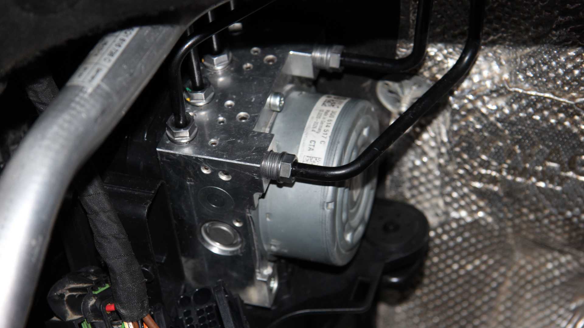 Гидравлический блок с закрепленным на нем контроллером тормозной системы установлен между расширительным бачком и щитком передка в левой части моторного отсека.