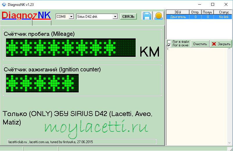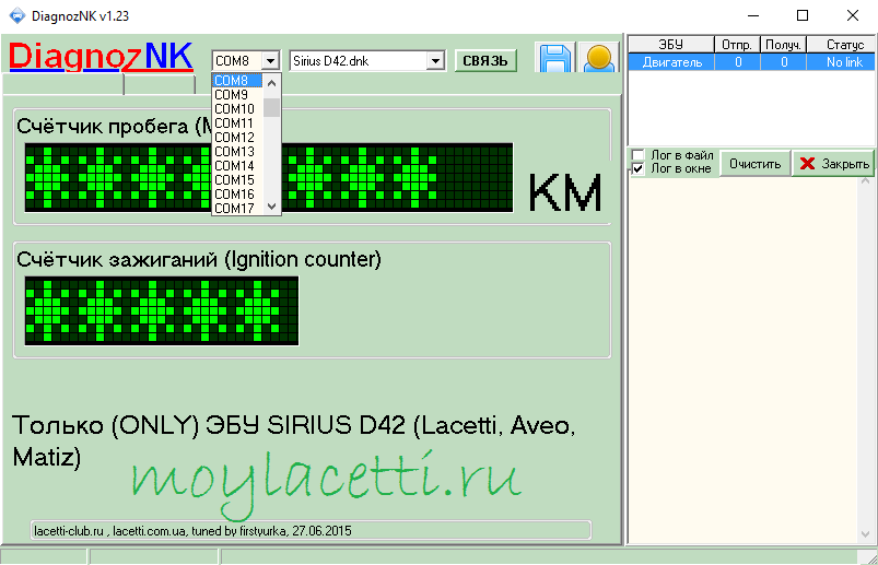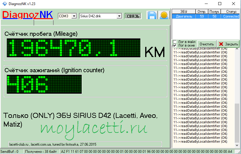 Осталось только включить зажигание на автомобиле и нажать кнопочку связь в программе. Сразу появятся данные пробега, сохраненные в ЭБУ