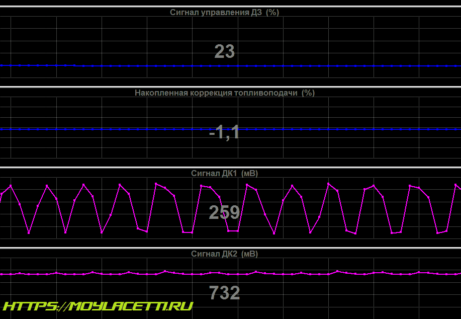 Сигнал первого датчика кислорода — в идеале должен иметь пилообразную форму на холостом ходу. При помощи него можно многое узнать о подаче топлива и о запорных свойствах форсунок. Более подробно о нем на странице Лямбда зонд