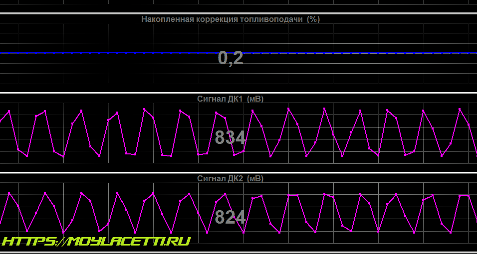 При диагностике необходимо обратить внимание на строку параметров сканера «ДК1-Банк 1», где отслеживается работа кислородного датчика. Когда сигнал датчика уходит в плюс, блок управления мгновенно меняет значение кратковременной коррекции в сторону минуса, прикрывая распыл форсунки