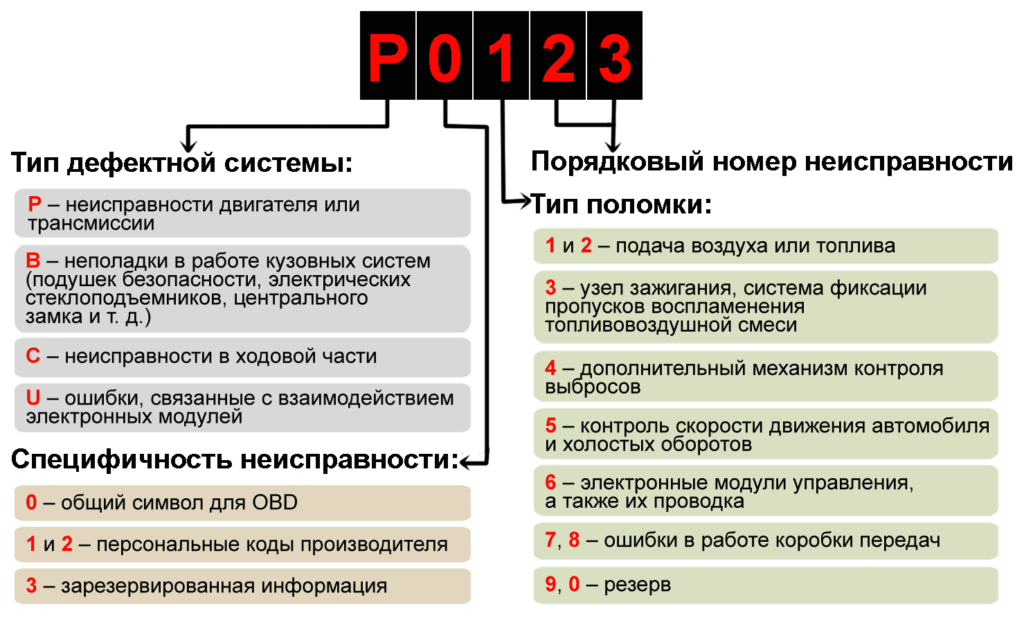 В пятизначных кодах первый знак обозначает принадлежность к системе, в которой обнаружена неисправность: