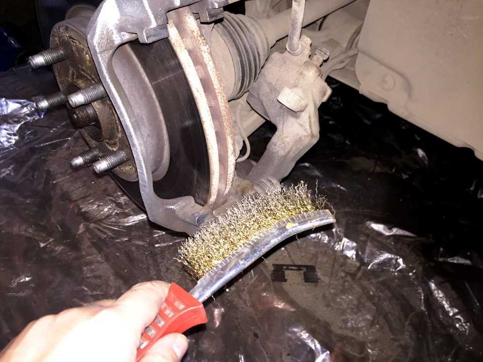 - Используя щётку по металлу, удалите потёки и следы коррозии с места, предназначенного для посадки колодок.