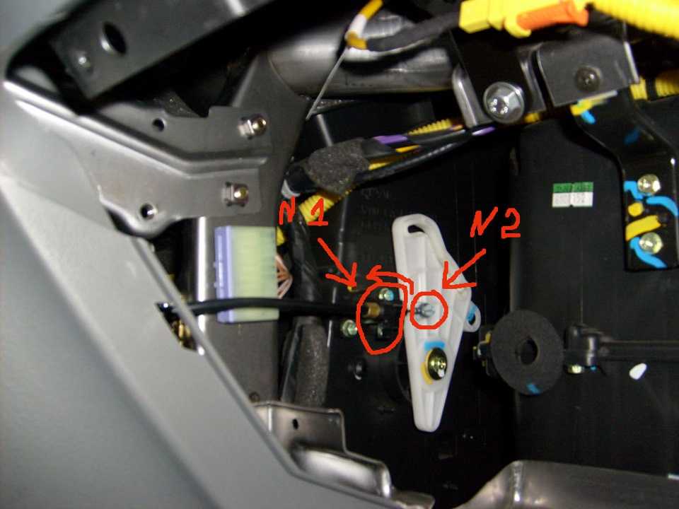 Тот же трос снимаем со стороны водительского кресла. Затем проводится демонтаж центральной панели. Извлеките аварийку и колодку проводов; Извлеките центральную панель.