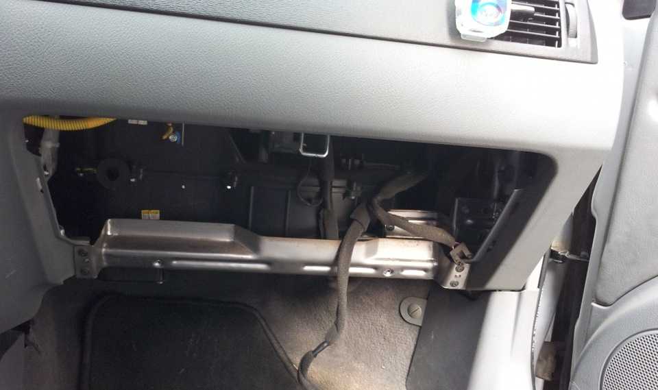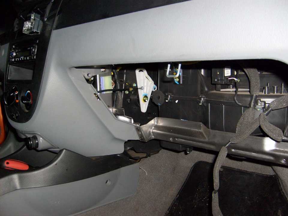 Откройте бардачок и открутите три верхних крепления. Затем снимите нижние саморезы. Отсоедините приводной трос регулирования отопителя.