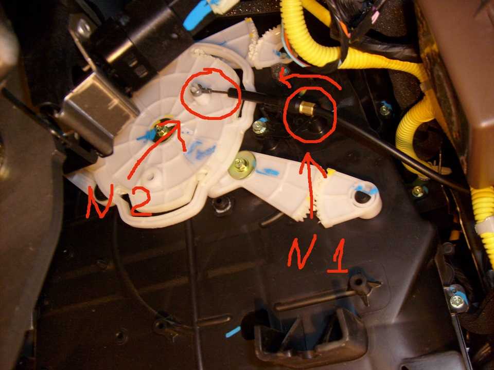 Итак, процесс снятия… К каждой такой шестеренке подходит тросик привода. он как водится в пластиковом кожухе. Пластиковый кожух на прикрепленной защелке крепится к держателю на стенке, а на конце тросика колечко — оно соответственно нацеплено на «пимпочку» на шестеренке Проще сначала снять его с крепления №1, а уже потом с крепления № 2. Крепление № 1 отстегивается вращательным движением (показано на рисунке).