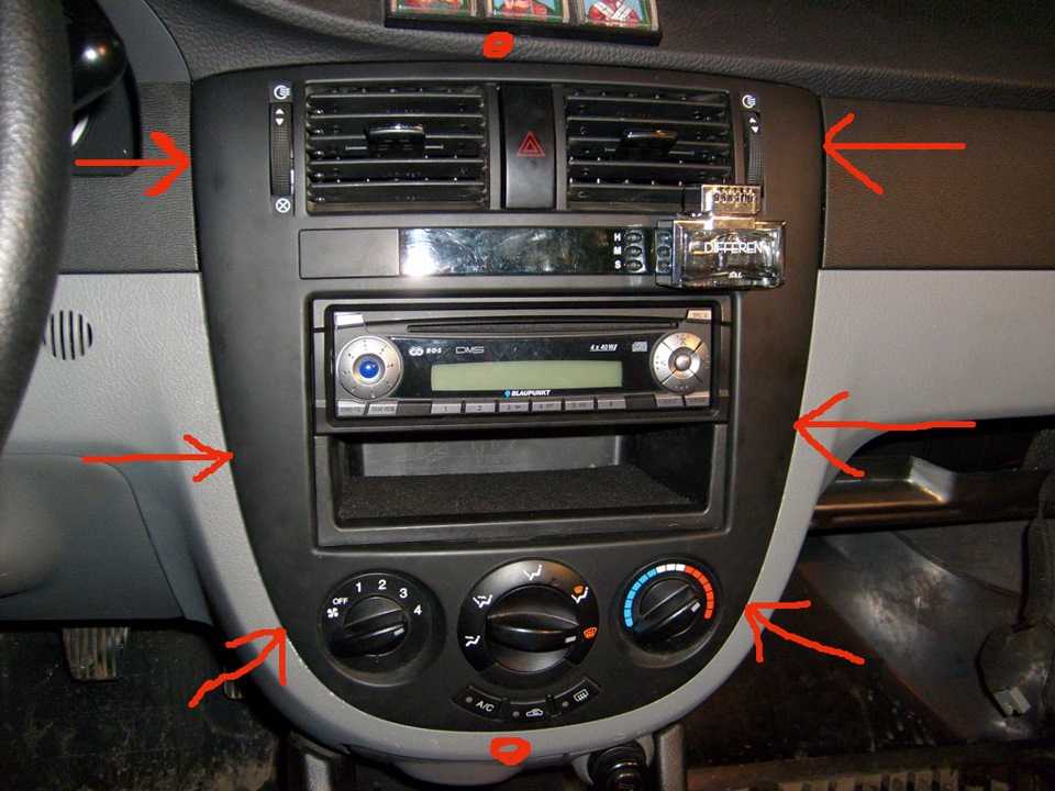 К говорилось выше, осуществить эту манипуляцию самостоятельно может каждый владелец автомобиля Chevrolet Lacetti. Инструкция по демонтажу штатной магнитолы. Скиньте клемму минус с аккумуляторной батареи.