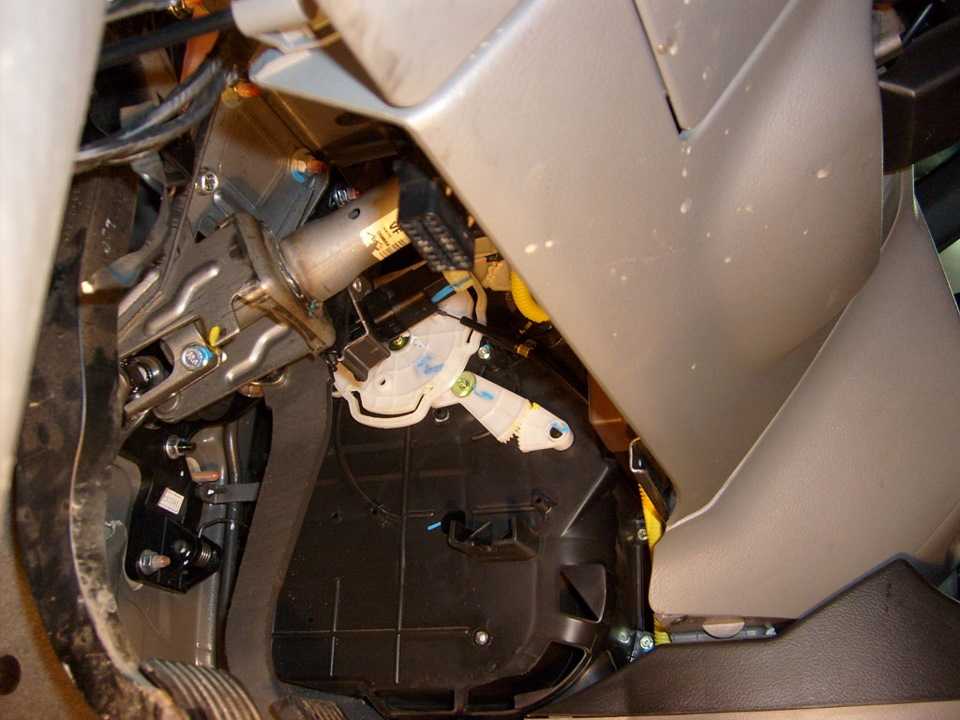 Но вот со стороны водительской…с ним немного сложнее. Прицеплен он конечно точно так же, но находится глубоко. Вам придется забраться под руль и действовать лежа на спине. Без фонарика не обойтись. Так что неудобства есть, но в принципе НИЧЕГО СЛОЖНОГО!