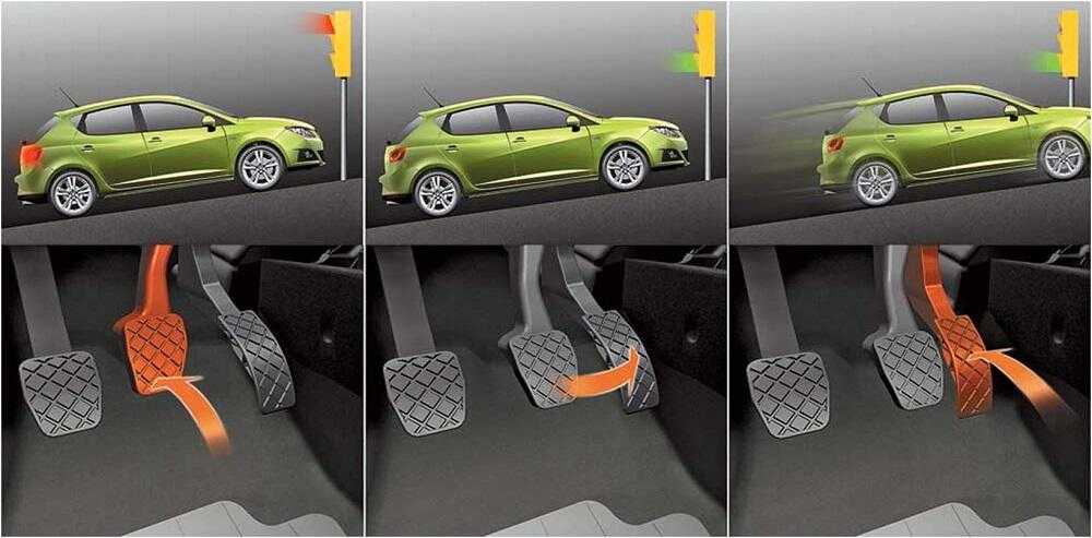 Теперь можно начать отпускать педаль тормоза и перекидывать ногу на газ. Делать это нужно плавно, иначе двигатель заглохнет. Этот момент переброски требует опыта, поэтому повторить его придётся не один раз.