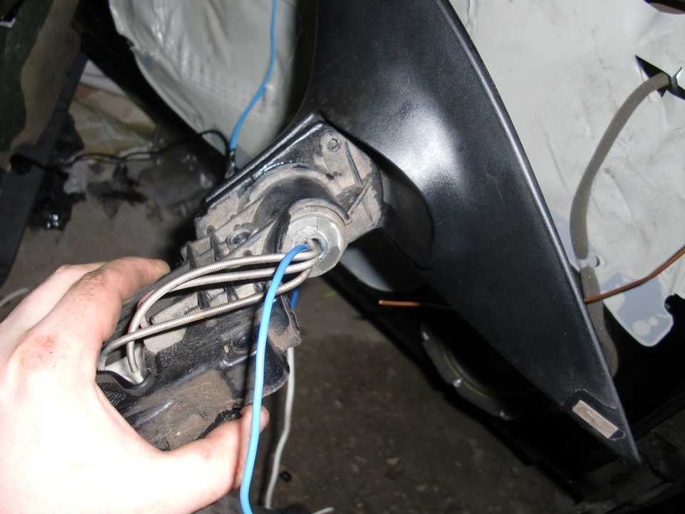 Идем далее. 6. Прикручиваем зеркала к дверям в обратном порядке демонтажа. Один провод надрезаем и прижимаем болтом к оголенной части двери. Так мы получим массу.