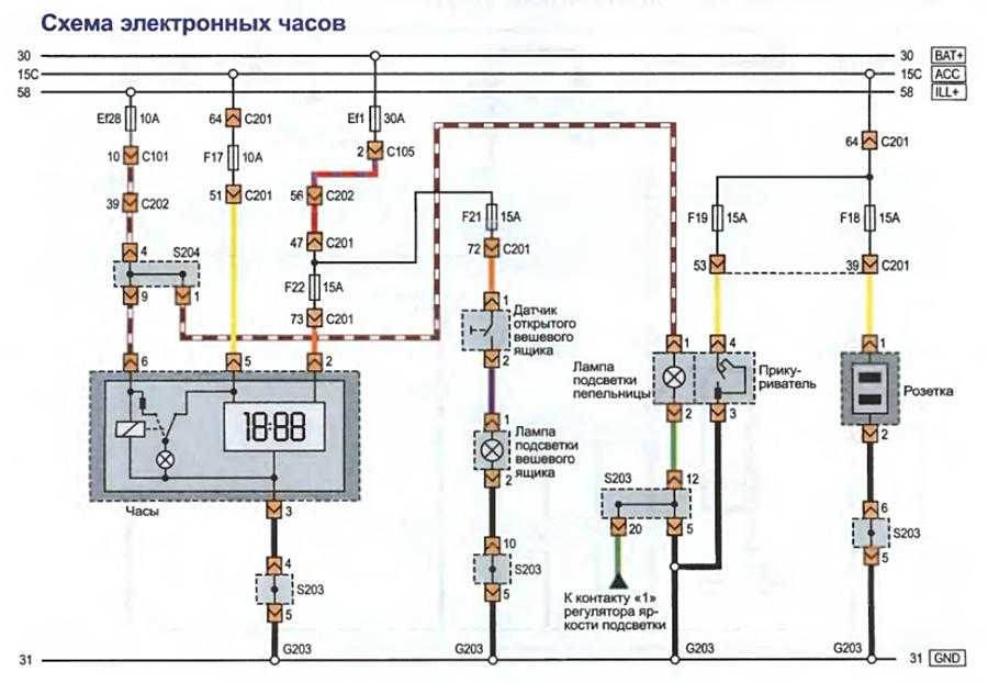 Тогда решил полностью разобрать часы и посмотреть саму плату на непропаи и трещины. Но ничего не нашёл. Единственное почистил зубочисткой между дорожками. Там в одном месте была капля типа канифоли, а в ней проблёскивали как-будто маленькие капельки олова. При помощи кисточки и спирта промыл и просушил плату. Я всегда промываю спиртом, когда ничего не нахожу подозрительного. На ВАЗ 2112 как то закапризнячал бортовой компьютер, тоже ничего не нашёл, промыл плату спиртом, и всё работает до сих пор.Перед тем как собирать часы подсоединил плату к фишке питания и слегка погнул её в разных направлениях — время не сбилось — похоже плата целая. Проверил питание на фишке и не понял — контакты не совпадают со схемой :Получается либо на схеме опечатка или то, что у меня машина 2012 года и вносились какие то изменения. Сами схемы из инструкции по ремонту и эксплуатации 2008 года. Правильное питание на часы для моей машины будет таким :. . 1 и 6 контакты на часах не используются — даже провода не идут. . 2 контакт — от 15С (ключ зажигания). . 3 контакт — от 58 (габариты). . 4 контакт — от 31 (масса). . 5 контакт — от 30 (батарея)