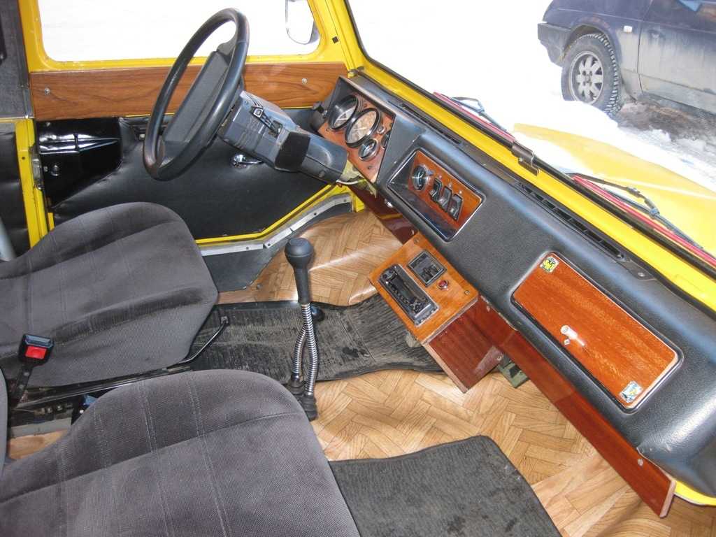 имеет эргономику вполне скоростного авто с учетом особенностей эксплуатации на бездорожье. Передние кресла — от BMW, задний диванчик — складное сиденье из багажника универсала «Волга» ГАЗ-2402. Жесткий металлический верх собран из деталей микроавтобусов Peugeot и ЕрАЗ, в сухую погоду его можно снять.
