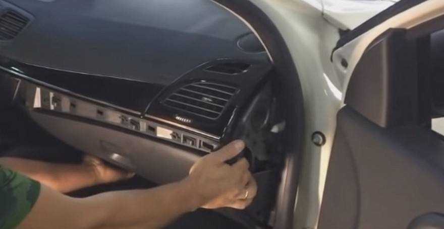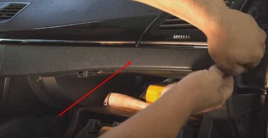 - Сдергиваем декоративную накладку сверху бардачка. Подставляем пальцы под накладку и тянем на себя.