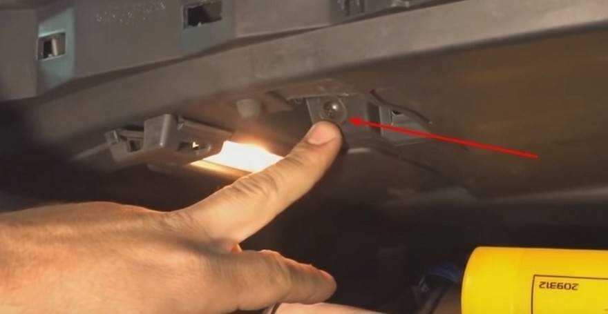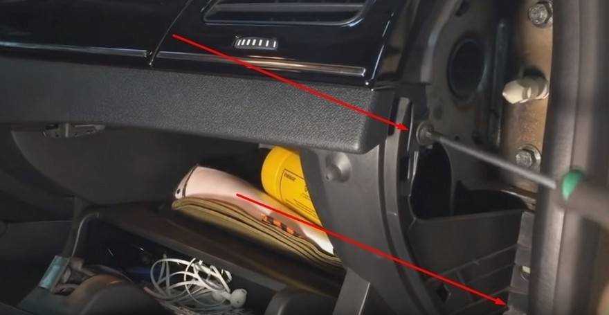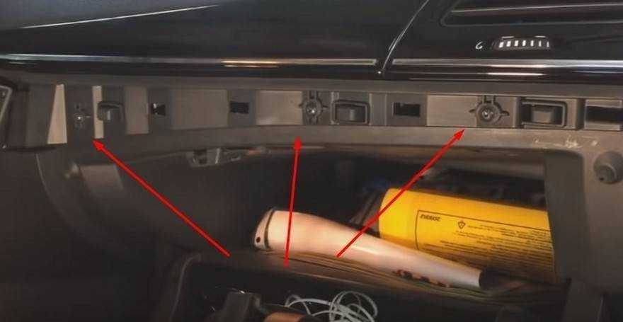 - После снятия накладки, открылось еще три винта крепления бардачка. Откручиваем винты, они тоже под Torx T20.