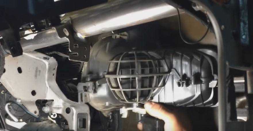 - Беремся за корпус вентилятора печки и поворачиваем по часовой стрелке до щелчка. Далее не спеша вынимаем и отсоединяем разъем питания.