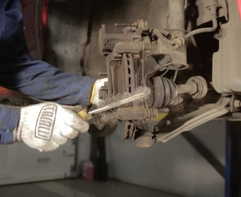 Металлической щёткой аккуратно очищаем суппорт от грязи