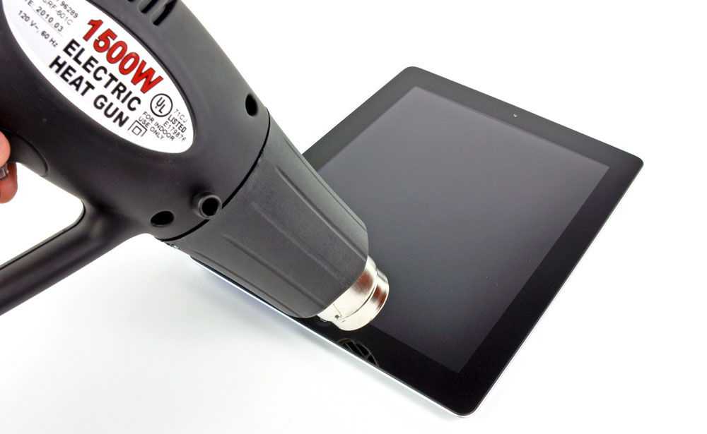 для начала нужно снять треснувший экран. При этом понадобится фен. С его помощью следует разогреть корпус планшета;