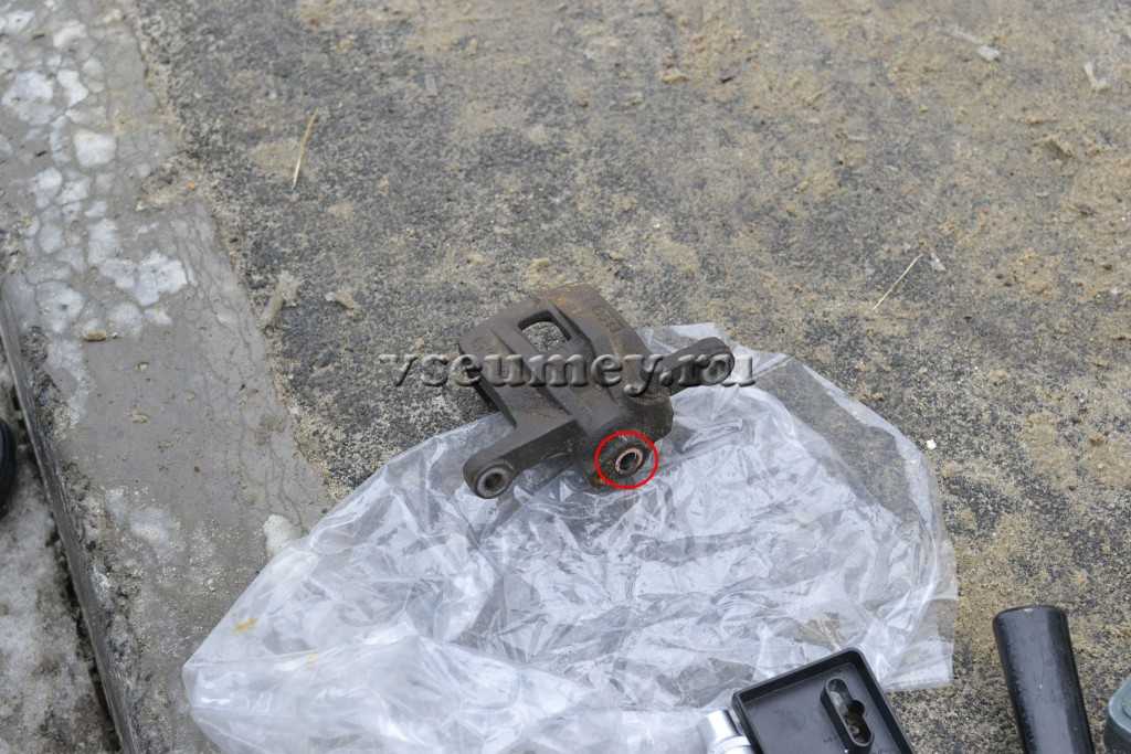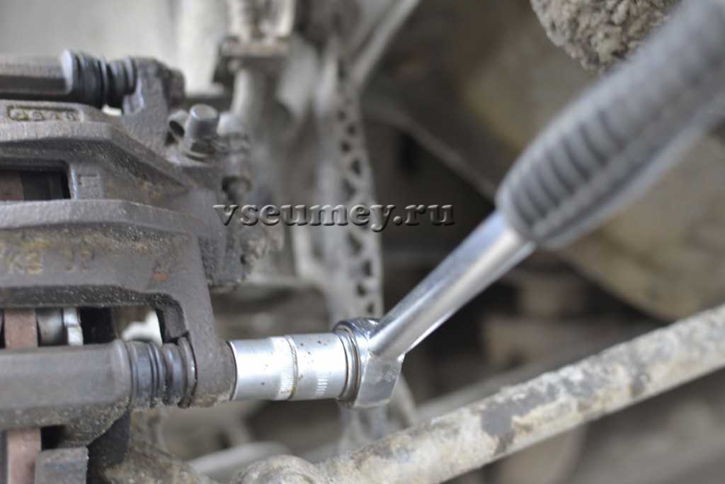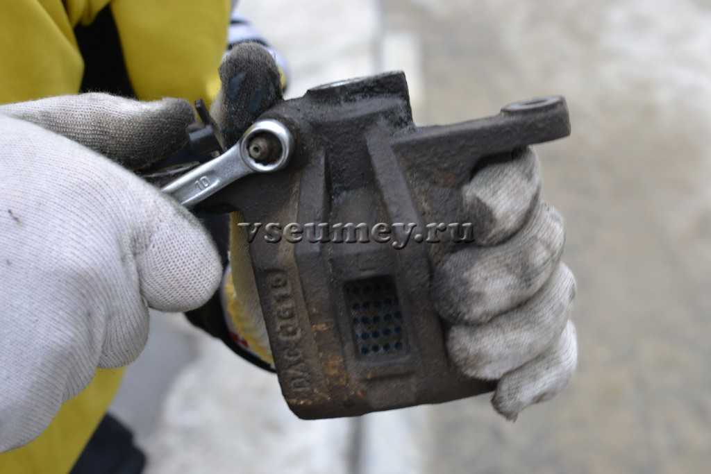 Прокачиваем тормоза, для этого откручиваем гайку на 10, одеваем специальный шланг для тормозной жидкости (подойдет шланг от 9-ки для омывайки) и опускаем в ёмкость с тормозной жидкостью и выпускаем воздух работая педалью тормоза. На фото эта гайка на старом суппорте.