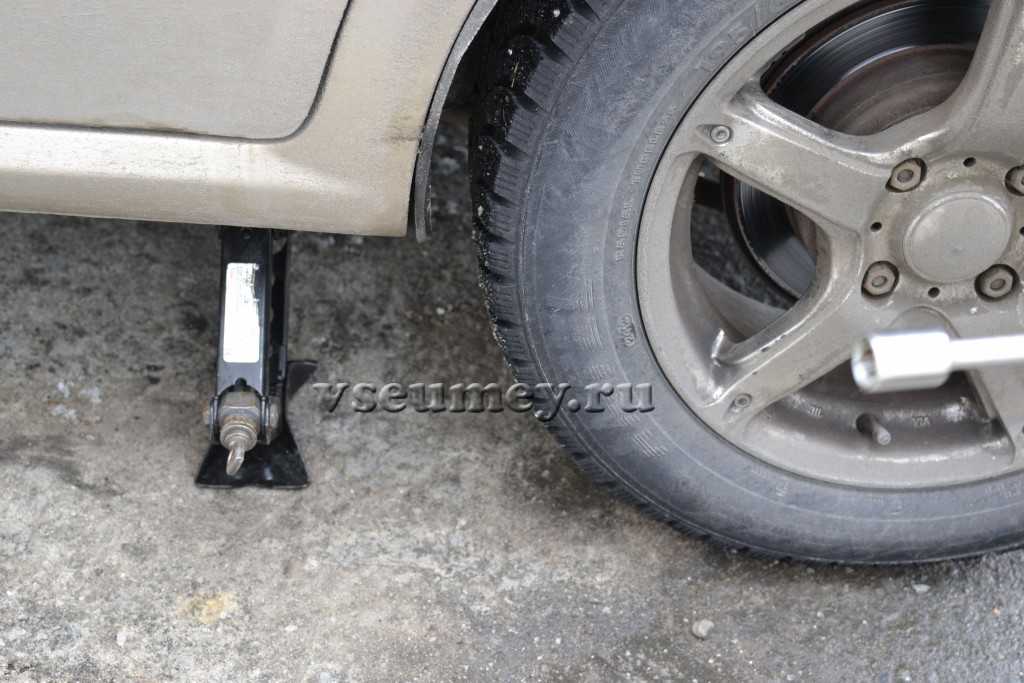 - Лучше всего рекомендуется установить автомобиль на яму, но если нет, то можно обойтись обычным домкратом. Поднимаем автомобильные домкраты снимаем заднее колесо.